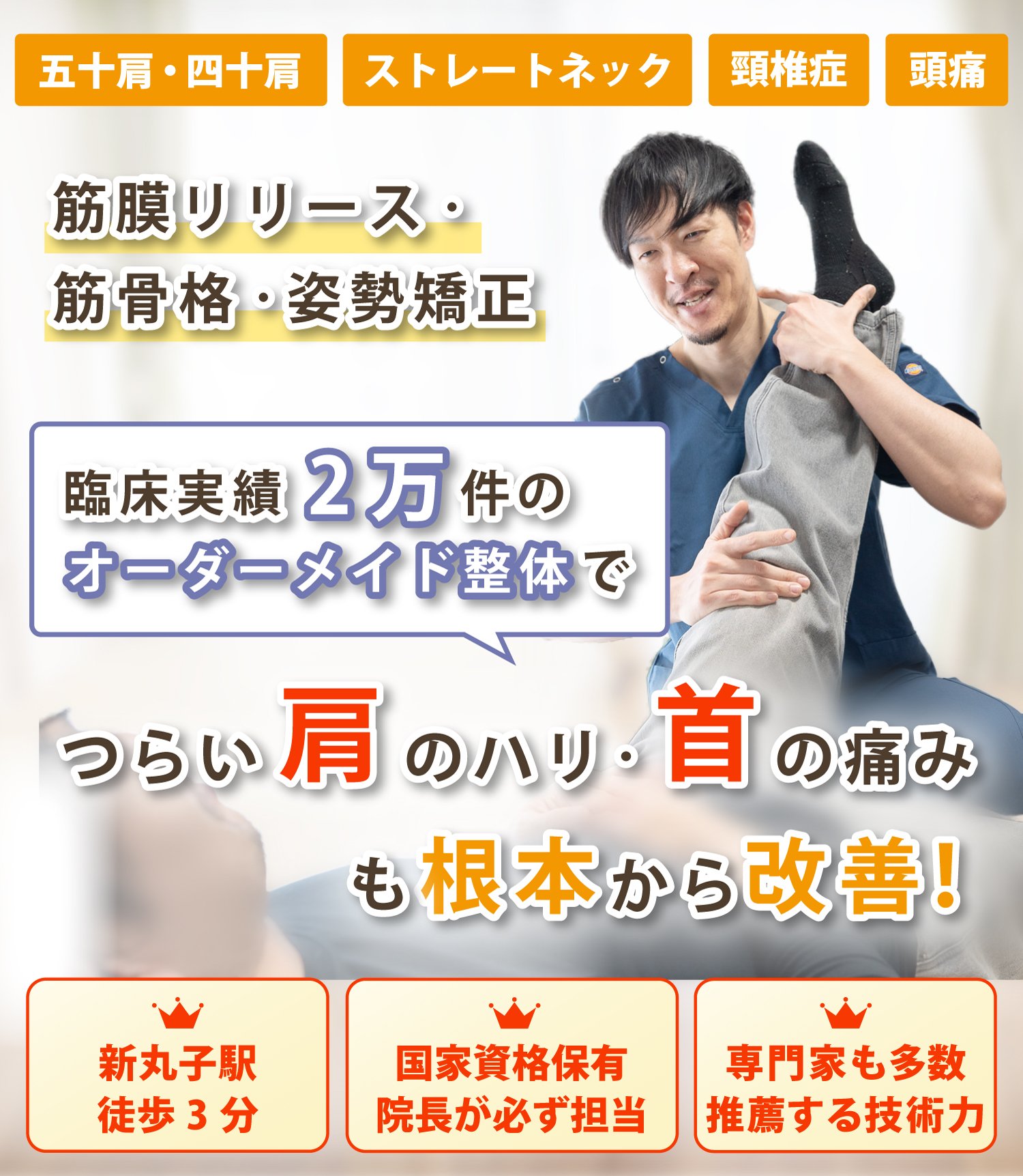 当院では、整骨院や整体院含め、10年以上の施術歴と臨床2万件以上の実績がある院長が必ず施術を担当しますので、一人ひとりに合わせたオーダーメイド整体が可能です。